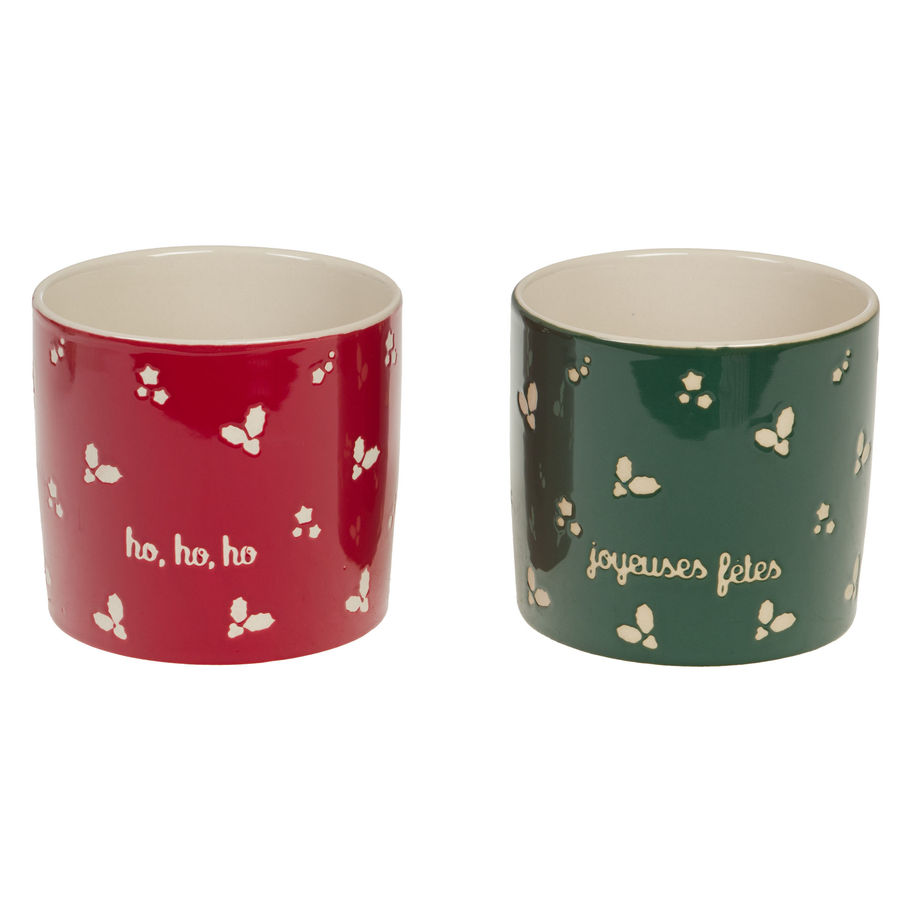 Cache-pot en céramique de 14 cm de diamètre, décliné en deux coloris festifs rouge et vert, ornés de messages de Noël "ho, ho, ho" et "joyeuses fêtes"
