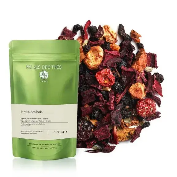 Infusion gourmande aux fruits et plantes, Jardin des bois est un mélange de sureau, de framboises et de baies qui évoque le début de l'automne en forêt.